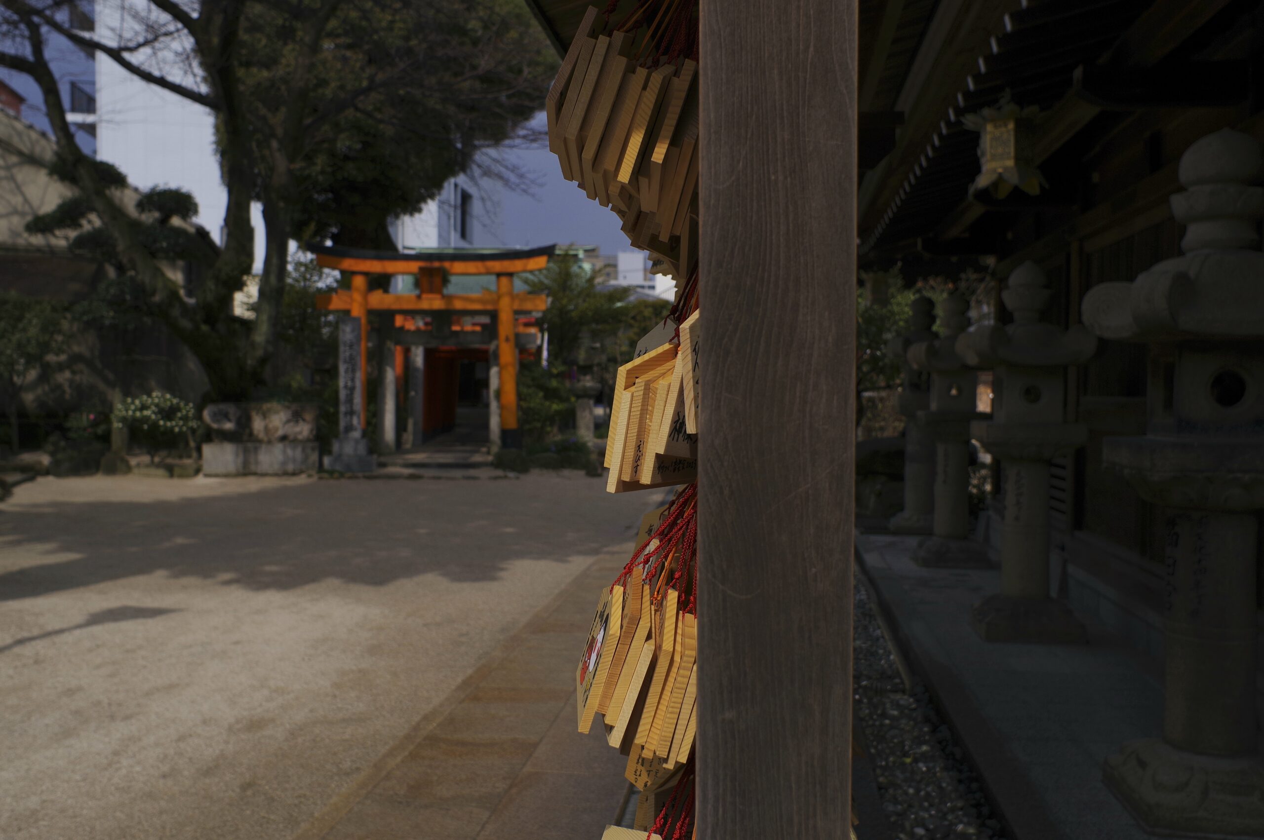 Ema plaques carrying silent wishes sway gently beside a path that leads through torii gates—Japan’s quiet spirituality framed in wood and stone.